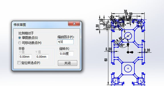 注意我们的缩放比例是“相对于草图原点”而言的,也就是说任意一点相对草图的距离扩大了4/3倍从而重新形成的新图形。
