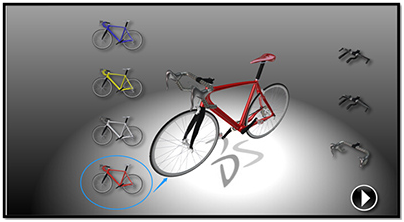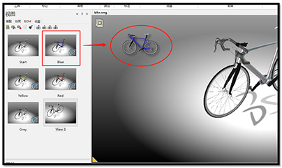 其余的互动按钮按照以上步骤依次操作。内容完成后,保存文件为“smg”的通用格式。在SOLIDWORKS Composer Player中打开,就可以实现颜色变化的互动体验了。图片展示的红色自行车颜色,就是通过点击红色互动按钮实现的。
